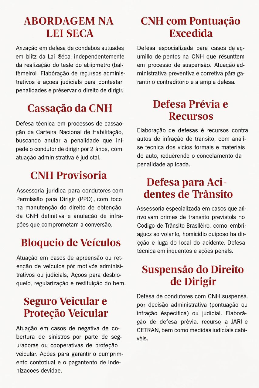 - Atuamos com excelência tanto na esfera administrativa — junto ao DETRAN, JARI, CETRAN e demais órgãos competentes — quanto na via judicial, mantendo como princípios a ética, a clareza na comunicação e o comprometimento com resultados reais e eficazes.